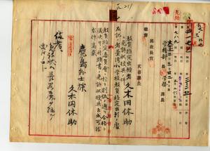 一九 鹿児島県小学校本科正教員免許状ヲ有スル鹿児島県師範学校訓導久木田休助(本籍地鹿児島県姶良郡国分村上小川・明治二〇年二月一日生・鹿児島県師範学校卒)ヨリ小学校本科正教員無試験検定出願ニ付キ免許状授与ノ件