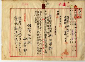 八 佐賀県小学校本科正教員免許状ヲ有スル元佐賀県藤津郡嬉野尋常高等小学校訓導兼嬉野農業補習学校訓導山口市郎(本籍地佐賀県藤津郡鹿島村大字中村・明治一八年一月七日生・佐賀県師範学校卒)ヨリ尋常小学校本科正教員無試験検定出願ニ付キ免許状授与ノ件