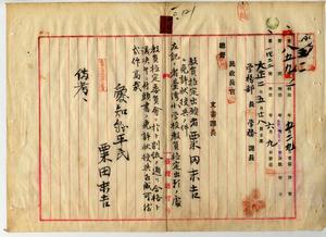 一〇 愛知県小学校本科正教員免許状ヲ有スル愛知県中島郡大和村興道尋常高等小学校訓導粟田末吉(本籍地愛知県幡豆郡横須賀村大字上横須賀・明治二〇年四月二四日生・愛知県第二師範学校卒)ヨリ尋常小学校本科正教員無試験検定出願ニ付キ免許状授与ノ件
