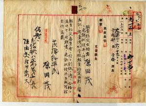 一六 茨城県小学校正教員免許状ヲ有スル元茨城県西茨城郡東那珂第一尋常小学校訓導兼校長原田茂(本籍地茨城県西茨城郡南山村大字南吉原・明治一五年一〇月一七日生・茨城県師範学校本科卒)ヨリ尋常小学校本科正教員無試験検定出願ニ付キ免許状授与ノ件