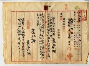一 台湾公学校訓練免許状ヲ有スル台北庁深坑公学校訓導黄奕明(本居地台北庁文山堡深坑仔庄土名麻竹藔・明治二一年一二月一日生・台湾総督府国語学校師範部乙科卒)ヨリ公学校訓導無試験検定出願ニ付キ大正二年三月二五日付ヲ以テ免許状授与ノ件