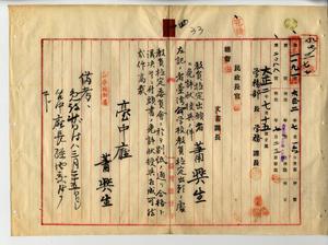 四 台湾公学校訓導免許状ヲ有スル彰化庁社頭公学校訓導蕭興生(本居地台中庁武東堡崙雅庄・明治一八年五月七日生・台湾総督府国語学校師範部乙科卒)ヨリ公学校訓導無試験検定出願ニ付キ大正二年三月二五日付ヲ以テ免許状授与ノ件
