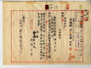 一一 島根県小学校本科正教員免許状ヲ有スル元島根県邇摩郡福光村尋常高等小学校訓導坪内タチ(本籍地島根県邇摩郡福光村・現住所台北庁大加蚋堡龍匣口庄・明治二二年一一月二七日生・島根県女子師範学校卒)ヨリ尋常小学校本科正教員無試験検定出願ニ付キ免許状授与ノ件