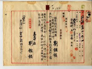 一二 台湾公学校訓導免許状ヲ有スル台中庁犂頭公学校訓導劉鑑銘(本居地台中庁捒東下堡水碓庄・寄留地同庁同堡犂頭街・明治一八年七月一六生・台湾総督府国語学校師範乙科卒)ヨリ公学校訓導無試験検定出願ニ付キ免許状授与ノ件