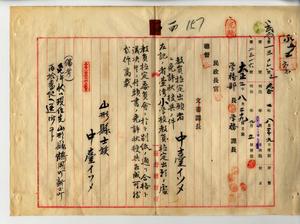 一四 山形県小学校本科正教員免許状ヲ有スル元山形県西田川郡大泉尋常高等小学校訓導並ニ山形県実業補習学校教授中台イソメ(本籍地山形県西田川郡鶴岡町新士町・明治二〇年三月三日生・山形県女子師範学校卒)ヨリ尋常小学校本科正教員無試験検定出願ニ付免許状授与ノ件
