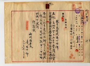 七 明治四五年三月台湾総督府国語学校小学師範部卒業小学校本科正教員免許状ヲ所有セル休職台湾小学校教諭青木十郎ヨリ原籍地ニ帰省中八月二五日ヨリ三日間ノ降雨ニヨリ最上川氾濫シ寄留地ノ山形県最上郡新庄町水上町大洪水ノ為メ辞令書等流失シタルニヨリ教員免許状再下付願出ニ付キ下付ノ件
