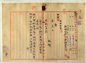 九 株式会社台湾商工銀行頭取取締役木村匡ヨリ基隆堡基隆街土名哨船頭ノ地ニ基隆支店設置開業届出ニヨリ其ノ旨ヲ台湾総督佐久間左馬太ヨリ大蔵大臣高橋是清ヘ進退ノ件