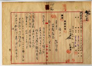 一九 宮城県ヨリ国第一六二七号ヲ以テ照会ノアリタル台南庁大竹里鳳山街ニ居住セル者ノ債務ニ関シ貸付金引継ニ付キ同県ヘ通知並ニ台南徴第一六八〇号ノ一ヲ以テ貸付金管理引受通知ニ際シ逓信大臣令達書・誓約書写資産ニ関スル書類写・徴収金調書ヲ台南庁ニテ保管スヘキ様台南庁長ヘ再送ノ件