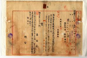 三 明治四四年一〇月三〇日付台南直第五二五号ヲ以テ台南庁長松木茂俊ヨリ稟申ノアリタル四四年地押調査ニ係ル開墾地業主権認定及土地台帳ヘ登録方ニ付キ指令第六七九九号ヲ以テ認可サレタル処右稟申書中楠梓仙添西里湾坵庄ニ係ル地番中誤記ナルモノヲ発見シタルヲ以テ訂正方台南庁長松木茂俊ヨリ台南直第二二二号ノ一ヲ以テ稟申アリタルニ付キ訂正方認可ス開墾地業主権認定及土地台帳登録地一筆限調書中地番誤記訂正ノ件認可ス(指令第七九五四号)[尚、台南直第五二五号を以て稟申された開墾地業主権認定及土地台帳登録地一筆限調書一括綴込一七七葉。]