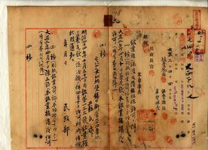 九 曽テ係争中ノ蘇氏乖ト秋山義一トノ間デ示談成立シタルニヨリ、(一)大正二年四月一〇日蔡先欽ヘ本鉱業権譲渡許可(指令第七七八三号)、(二)蘇氏乖ノ明治四四年一〇月三一日付鉱第一三三号鉱業権ヲ蔡先欽ヘ譲渡願ノ権許可通知ノ件、(二)大正二年四月一〇日陳五豹ヘ本鉱業権譲渡許可(指令第七七八四号)、(三)蔡先欽ヘ大正二年四月二日付鉱第一三三号鉱業権ヲ陳五豹ヘ譲渡願ノ件四月一〇日許可通知、(四)大正二年四月一〇日秋山義一ヘ本鉱業権ノ一番書入許可(指令第七七八五号)、(五)秋山義一ノ代理人安田勝次郎ヘ大正二年四月二日付鉱第一三三号鉱業権債権担保願ノ件四月一〇日一番書入許可通知