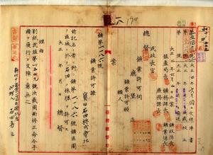 一八 新潟県長岡市城内町宝田石油株式会社社長山田又七・代理人新竹庁苗栗一堡出礦坑庄石田喜三ヨリ出願ノ新竹庁竹南一堡内湾庄・永和山庄・濫坑庄・大坪林庄及ヒ苗栗一堡赤崎仔庄・造橋庄・老田藔庄之内石油鉱区ニ於テ石油鉱採掘ニ付キ鉱第一一八六号鉱区図ノ区域ニ於テ石油ノ採掘ヲ許可ス