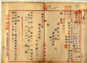 二一 矢野猪之八ヨリ願出タル台北庁文山堡排藔庄土名石碇仔埔・番仔坑及ヒ同堡大渓茄庄土名蚯蚓坑ノ内ノ石炭採掘ニ付キ共同工業権者劉隆修ヲ削除シ且ツ民殖第七五六号決裁ノ図面修正命令ニ従ヒ石炭鉱業修正図提出ヲ以テ鉱第一一八八号鉱区図ノ区域ニ於テ石炭ノ採掘ヲ許可ス[原本中、国館原本文書番号297・280・281・282・283・284・285・286は件番号紙片の誤貼のため本件に綴られるべき処、次件の第二二件に誤って入れられているので注意を要す。従って、本件は、同文書番号260~286、次件は287~292となる。]