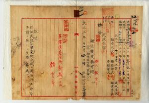 一一 顔雲年ヨリ願出ノ明治四三年八月一一日許可鉱第一〇二七号台北庁石碇堡莊魚坑庄土名八份藔・滴水坑・頂坪・不仔上天ノ石炭鉱区ヲ増区シ鉱区ヲ変更スルノ件許可ス(指令第一〇六七二号)