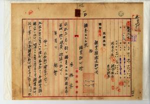 一五 渡辺辰五郎ヨリ明治三五年一〇月一三日許可鉱第三九五号台北庁芝蘭一堡草山庄土名七股及ヒ同庁芝蘭二堡竹仔湖庄土名後山ノ硫黄鉱区ノ鉱業権ヲ陳振栄ニ譲渡スルノ件鉱第三九五号鉱区図ノ区域に於ケル採掘ヲ許可ス尚、当該鉱区ノ鉱業権ハ明治四一年一二月八日付ヲ以テ鉱業人渡辺辰五郎が債権者陳振栄ニ負債金一二〇〇円ノ担保トシテ差入レタモノニシテ総督府ハ明治四二年一月一一日付指令第五四号ヲ以テ了承セシモノナリ[本件に関する書類綴込]