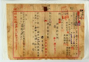 八 鉱業出願人ノ原籍愛知県中島郡稲沢町字下津ニシテ現住所台北庁大加蚋堡西門外街ノ桜井貞次郎ヨリ新竹庁苗栗一堡桂竹林庄土名老北藔官有地ニ於テ石油採掘願ニ付キ分裂修正ノ上鉱第一二一九号ヲ以テ石油ノ採掘ヲ許可ス