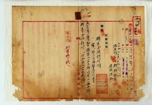 一二 原籍島根県出雲国松江市大字西津田ニシテ現住所台北庁大加蚋堡三板橋庄ノ鉱業人高橋龍之助ヨリ願出ノ新竹庁竹南一堡崁頂藔庄、竹北一堡十二藔庄及ヒ石硬仔庄地内ノ大正元年一二月二八日許可鉱第一一六二号石炭鉱区ニ新竹庁竹南一堡田尾庄、崁頂藔庄、竹北一堡藤坪庄及ヒ十二藔庄地内ノ大正元年一一月一五日許可鉱第一一四五号並ニ新竹庁竹南一堡田尾庄、崁頂藔庄、竹北一堡藤坪庄地内ノ大正元年一二月二八日許可鉱第一一五五号石炭鉱区ノ合併願ニ付キ大正二年一二月三日指令第一一〇七五号鉱第一一六二号鉱業許可証裏書ニテ鉱区合併願ヲ許可ス[次の第一三文書も見よ]
