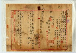 二一 原籍埼玉県比企郡高坂村大字巌殿ニシテ現住所台北庁芝蘭二堡北投庄ノ旧鉱業人渡部辰五郎ト台北庁芝蘭三堡淡水街土名米市街ノ鉱業人蔡火炎ヨリ台北庁文山堡青潭庄土名員潭仔坑ノ石炭鉱区ニ於テ石炭鉱採掘願ニ付キ鉱第一二二一号ヲ以テ石炭ノ採掘ヲ許可ス