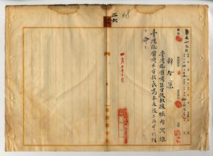 二六 台湾総督府医学校長高木友枝ノ稟申ニヨリ高木友枝医学校長ガ研究所技師トシテ東京・京都・大阪ヘ出張スル際台湾総督府医学校教授堀内次雄ニ台湾総督府医学校長高木友枝不在中ノ代理ヲ命ス