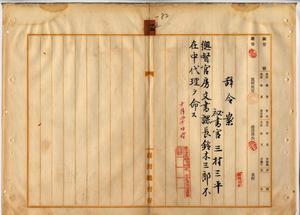 一五 台湾総督官房秘書官三村三平ニ総督官房文書課長鈴木三郎不在中代理ヲ命ス