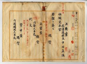 二 花蓮港庁長中田直温ヨリ自己便宜ノ為メ辞職ヲ願出タルニヨリ依願本官ヲ免シ事務格別勉励ニ付キ一時金ヲ賞与ス