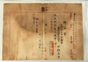 一三 殖産局長高田元治郎ノ内申ニヨリ民政部土木部勤務台湾総督府技手中根真吉ニ博物館附属事業トシテ動物園経営ノ結果動物収容器具調製ノ必要アルニヨリ民政部殖局兼務ヲ命ス