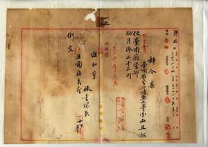 一五 台南庁長松木茂俊ノ内申ニヨリ台南市内ノ私立里見医院ニテ療養中ノ台南庁警部補小山丑松ハ黒水病ニ罹リ危篤(一月二日死亡)トナリタルニヨリ職務勉励成績可良ノ者ナルヲ以テ特別詮議ヲ以テ辞令日ヲ遡上リ台南庁警部ニ任シ昇級ノ上事務格別勉励ニ付一時金ヲ賞与ス