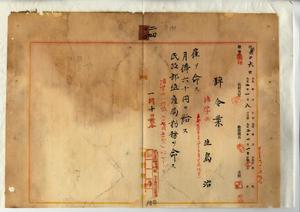 二四 殖産局長高田元治郎ノ具申ニヨリ蚕業事務ニ従事セシムル為メ京都帝国大学法科大学卒業法学士生島治ニ雇ヲ命シ民政部殖産局勤務を命ス
