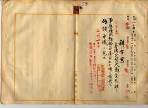 七 台湾公医大島杢太郎ハ疾病ニ罹リ職ニ堪ヘサル旨ヲ以テ退職ヲ願出タルニヨリ事務格別勉励ニ付キ一時金一五〇円ヲ賞与シ本職ヲ免ス
