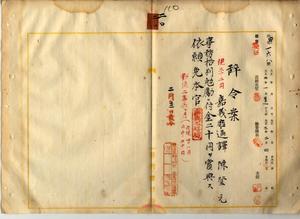二〇 嘉義庁長津田毅一ノ内申ニヨリ台湾総督府嘉義庁通訳陳登元ハ疾病ニ罹リ職ニ堪ヘサル旨ヲ以テ辞職ヲ願出タルニヨリ事務格別勉励ニ付キ一時金ヲ賞与シ本官ヲ免ス