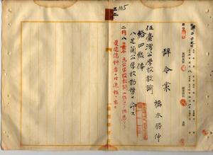 三五 台北庁長井村大吉ノ内申ニヨリ熊本県士族橋本勝伸ヲ台湾公学校教諭ニ任シ四級俸ヲ給シ八芝蘭公学校勤務ヲ命ス