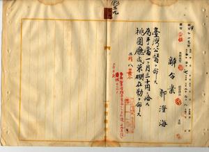 三九 桃園庁長西美波ト台湾総督府民政部警察本署長亀山理平太ノ内申ニヨリ桃園庁竹北二堡咸菜硼街ノ開業医郭澄海ニ台湾公医ヲ命シ桃園庁咸菜硼在勤ヲ命ス