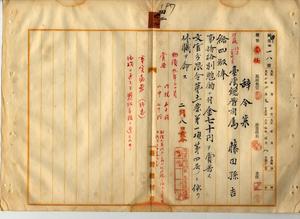 四二 法務部長代理石井為吉ノ内申ニヨリ台湾総督府属藤田孫吉ニ事務格別勉励ニ付キ一時金ヲ賞与シ文官分限令第一一条第一項第四号ニヨリ休職ヲ命ス