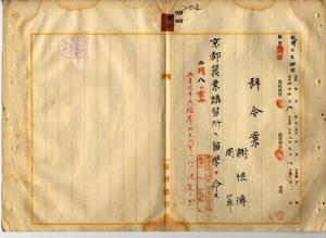 四四 殖産局長高田元治郎ヨリ照会ノ台湾総督府蚕業講習卒業生謝継伝ト周罩ニ京都蚕業講習所ヘ留学ヲ命ス
