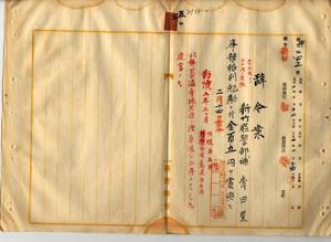 五〇 新竹庁長家永泰吉郎ノ内申ニヨリ台湾総督府新竹庁警部補青田豊ハ北勢蕃隘勇線前進ノ際ニ負傷シ不具トナリタル為メ職ニ堪ヘサル旨ヲ以テ辞職ヲ願出タルニヨリ依願退官シ事務格別勉励ニ付一時金ヲ賞与ス