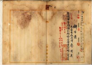 九 台南庁長松木茂俊ノ内申ニヨリ疾病ノ為メ退官願ヲ提出シタル元台南庁通訳廖用其ヘ事務格別勉励ニ付キ一時金ヲ賞与ス