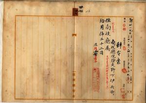 四七 南投庁長石橋亨ノ稟申ニヨリ南投税務吏野下伊兵衛ヲ南投庁属ニ任ス