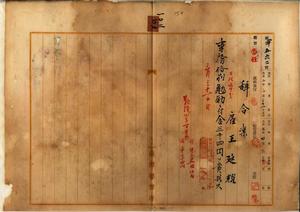 一〇二 財務局長中川友次郎ノ内申ニヨリ官房統計課勤務ノ台湾総督府雇王廷耀ヲ免雇トスル為メ事務格別勉励ニ付一時金ヲ賞与ス