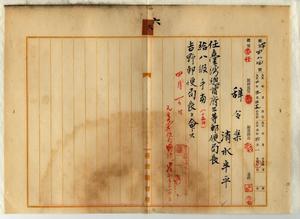 六 通信局長角源泉ノ内申ニヨリ来ル四月一日ヨリ開局スル吉野郵便局ノ為メ群馬県立藤岡中学校中退宇都宮郵便局通信伝習生養成所卒業台東郵便局通信助手兼通信事務員清水半平ヲ台湾総督府三等郵便局長ニ任シ吉野郵便局長ヲ命ス
