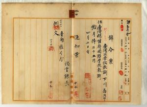 二〇 台湾総督府国語学校校長隈本繁吉ノ教諭任用内申ニヨリ台南第一公学校勤務台湾公学校教諭下川高次郎ヲ台湾総督府国語学校教諭ニ任ス