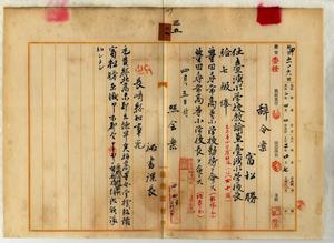 三五 花蓮港庁中田温直ノ内申ニヨリ休職長崎県北高来郡諫早実科高等女学校教諭富松勝ヲ台湾小学校教諭兼台湾小学校長ニ任シ豊田尋常高等小学校勤務ヲ命シ豊田尋常高等小学校長ヲ命ス