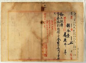 七二 台湾総督官房文書課長鈴木三郎ノ内申ニヨリ病気危篤ニ陥リタル属庭井尋ニ進級ノ上事務格別勉励ニ付一時金ヲ賞与ス