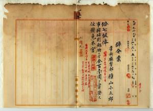 一五 疾病ニヨリ職ニ堪ヘザルヲ以テ辞職ヲ願出タル台南庁警務部勤務台南庁警部積山小太郎ヲ昇級ノ上事務格別勉励ニ付一時金ヲ賞与シ依願本官ヲ免ス