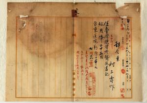 五九 台東医院長事務取扱門馬健也ノ内申ニヨリ台北庁巡査村上寿作ヲ台湾総督府医院書記ニ任シ台東医院勤務ヲ命ス