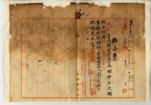 三五 脚気ニ罹リ職ニ勘エザルヲ以テ辞職ヲ願出タル新竹郵便局勤務台湾総督府通信属田中三之助ニ対シ新竹郵便局長岡垣重蔵ノ内申ニヨリ昇級ノ上事務格別勉励ニ付キ一時金ヲ賞与シ依願本官ヲ免ス
