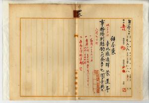 四九 台北庁長井村大吉ノ内申ニヨリ疾病職ニ堪ヘサル旨ヲ以テ辞職ヲ願出タル台北庁通訳葉蓮亭ニ事務格別勉励ニ付キ一時金ヲ賞与ス