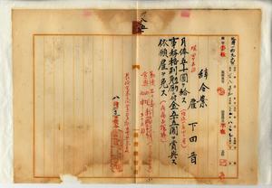 八五 雇下田晋ハ疾病ニ罹リ職ニ堪エサル旨ヲ以テ辞職ヲ願出タルニヨリ事務格別勉励ニ付キ一時金ヲ賞与シ雇ヲ免ス