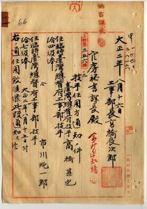 一一 工事部長高橋辰次郎ヨリ台湾総督府技手ノ高橋甚也ト市川純一郎ヲ臨時台湾総督府工事技手ニ任命シタルコトヲ官房秘書課長ヘ通知ノ件