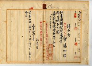 三五 嘉義郵便局長島覚治ノ内申ニヨリ嘉義郵便局雇通信助手実藤四郎ヲ台湾総督府通信手ニ任シ嘉義郵便局勤務ヲ命ス
