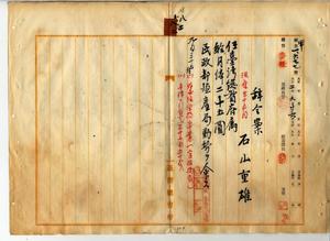 八二 殖産局長高田元治郎ノ具申ニヨリ東京外国語学校西語学科卒業台湾総督府雇石山重雄ヲ林務庶務ニ従事セシムル為メ台湾総督府属ニ任シ民政部殖産局勤務ヲ命ス
