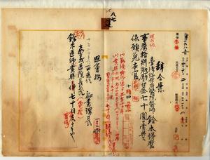 八七 脚気ニ罹リ職ニ堪エサル旨ヲ以テ辞職ヲ願出タル嘉義医院勤務台湾総督府医院医員鈴木悌麿ヲ事務格別勉励ニ付キ一時金ヲ賞与シ依願本官ヲ免ス